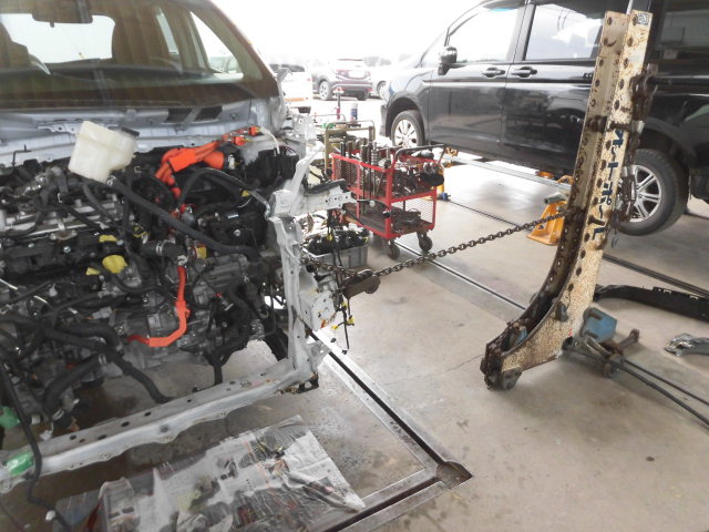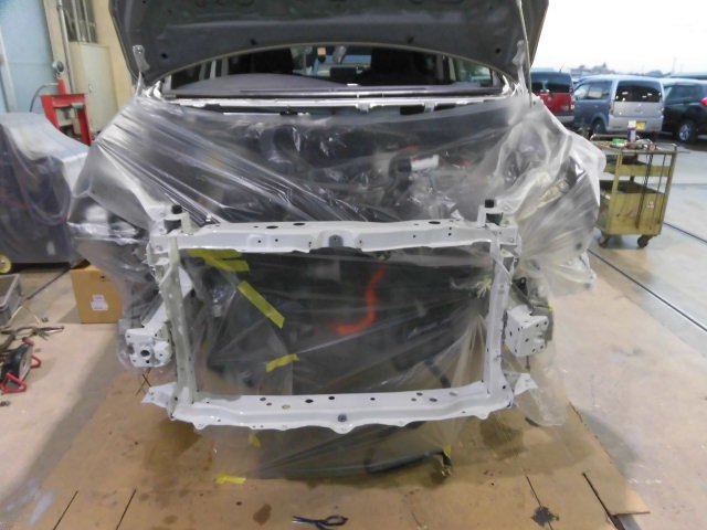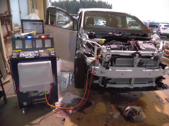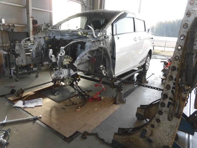 トヨタシエンタ前廻り修理です。事故による損害が車体内部まで生じている為