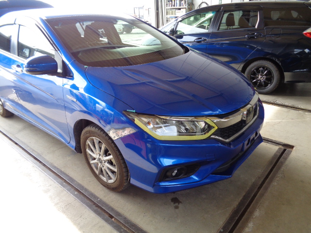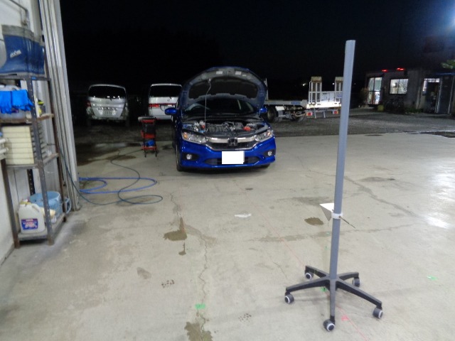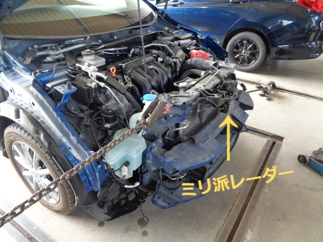 小山市高野自動車工業です。ホンダグレイス、右前の損傷。Frバンパ、右ヘッドライト交換、右Frフェンダーは鈑金となります。車体骨格を計測すると、左側にズレていることが判明。車体骨格を正しい位置に修正をします。このお車にはバンパを外した骨格に、ミリ波レーダーが付いています。ミリ波レーダー自体の損傷は見られませんが、ミリ波レーダーが付いている骨格の修正を行った為、エイミングが必要になってきます。鈑金作業完了後は、