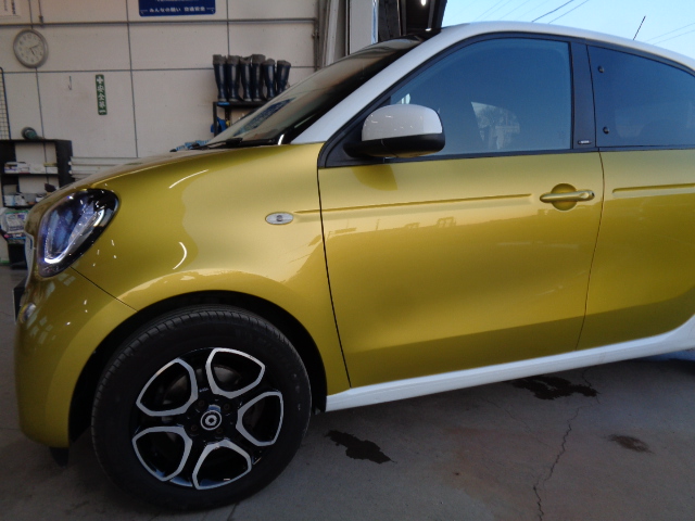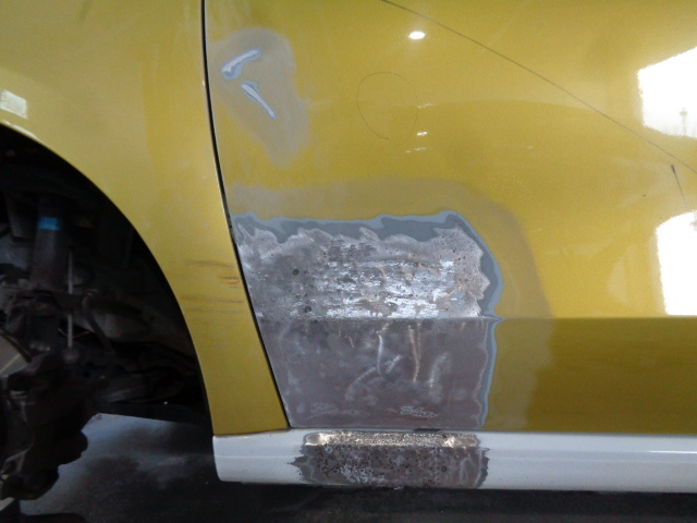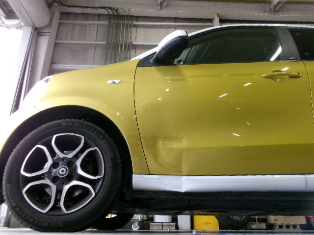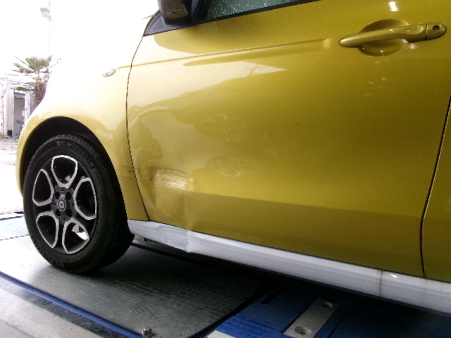 小山市高野自動車工業です。今回のご依頼はスマート。左フロントドアはドアの裏まで損害が及んでいますが、全て鈑金で修正していきます。