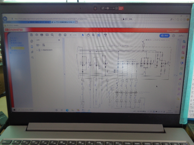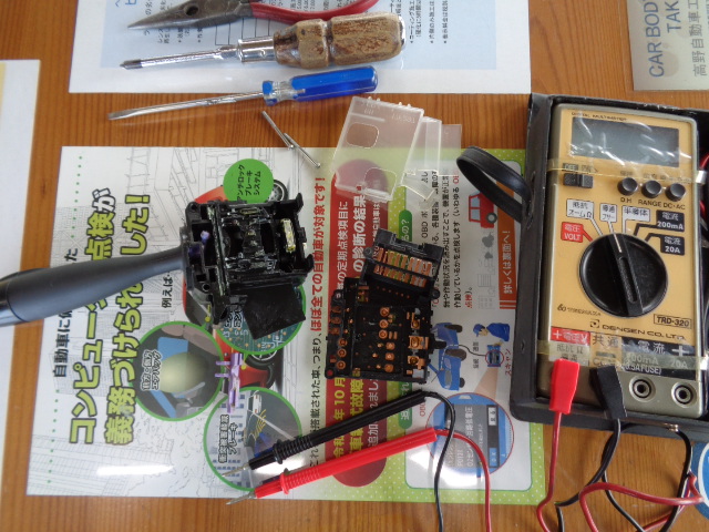 症状としては、車室内の表示灯類は作動点灯しますが、メーター含めインパネ周りの照明が点かない。合わせて後ろ外部のランプ類は、各表示灯は作動点灯するのですが、ナンバー灯/テールポジション灯が点かない、といったところです。どこに原因があるのか、この車両の配線図とにらめっこです。各機能部位と症状と配線を洗い出し、紐付け、怪しいなとにらんだ所が一発的中!!原因は、ライトの機能式スイッチ部内の汚れによる接点不良でした。清掃をして組付けを行い正常に戻りました。弊社は鈑金塗装専門店ですが、このようなご依頼も高野自動車工業へご相談ください。
