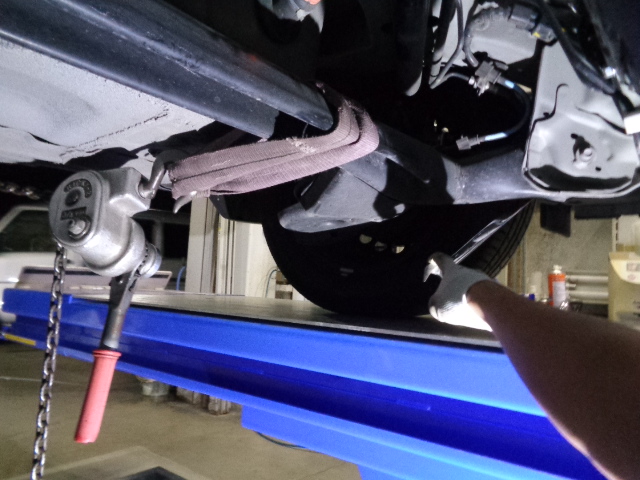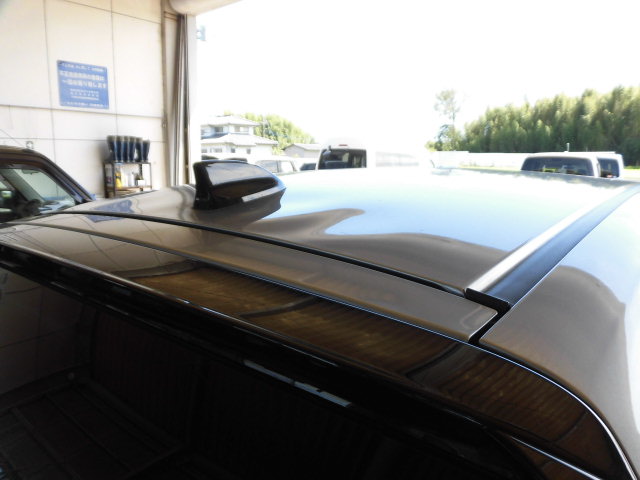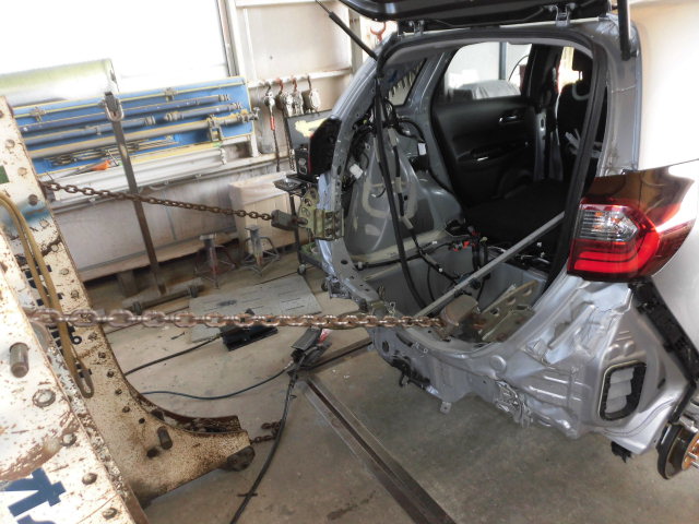 損傷診断を行い、損害のある部分と損傷の無い部分を確認、把握。確認後フレーム修正機にて、ボディー寸法図を確認しながら歪んだボディーを正確な位置に修正を行います。ルーフも損傷が見られておりましたが、修正作業のみでルーフの歪みを修正することが出来たので、ルーフは鈑金を行わずに修正が完了しました。車体アライメントを正確に修正した後は、塗装を行い完成となりますが、先進全自動車の車体修復後お客様が安心安全にお車にお乗り頂くためには、まだ作業が必要となります。先進安全自動車には、センサーやミリ波レーダー、カメラ等が装備されており、それらの電子制御装置が働くことで、安全を予防する役目を担っています。それらが正常に機能をするためには、車体中心軸と車体の進む方向にスラスト角が発生しないよう、整備、車体整備をすることが必要となってきます。車体は計測をし正確な修正が完了している為、この後は四輪アライメントが正確か、スラスト角が発生していないか点検・調整をするために、四輪ホイルアライメントテスターにて計測、調整をします。車体の進行方向を決めるのは、前輪ではなく後輪です。弊社車体整備業ならでは、前輪だけでなく後輪も調整を行い、調整後はスラスト角が0°である事を確認をし、車体に対して真っすぐ進むよう足回りの整備も完了しました。今回は、エイミング作業は発生しませんが、必要時はエイミングも行い、電子制御装置の点検・調整・登録が必要になります。鈑金塗装は、外観をきれいに直すだけでは無く、装備された先進安全装置の機能復帰も大切な作業となります。先進安全自動車の車体修復は、設備、知識、技術のある小山市高野自動車工業へお任せください。