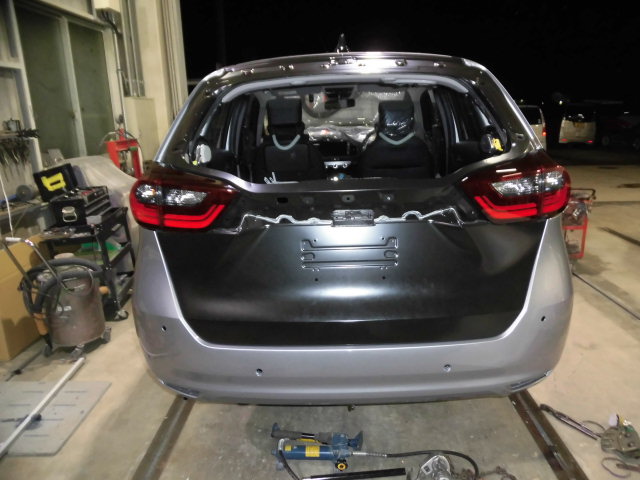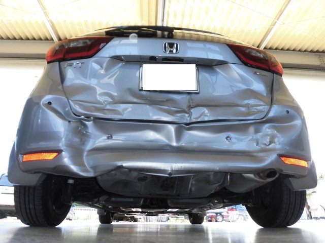 栃木県小山市、高野自動車工業です。新型フィットリヤ廻り損傷。この車は、HONDASENG付車、先進安全自動車です。